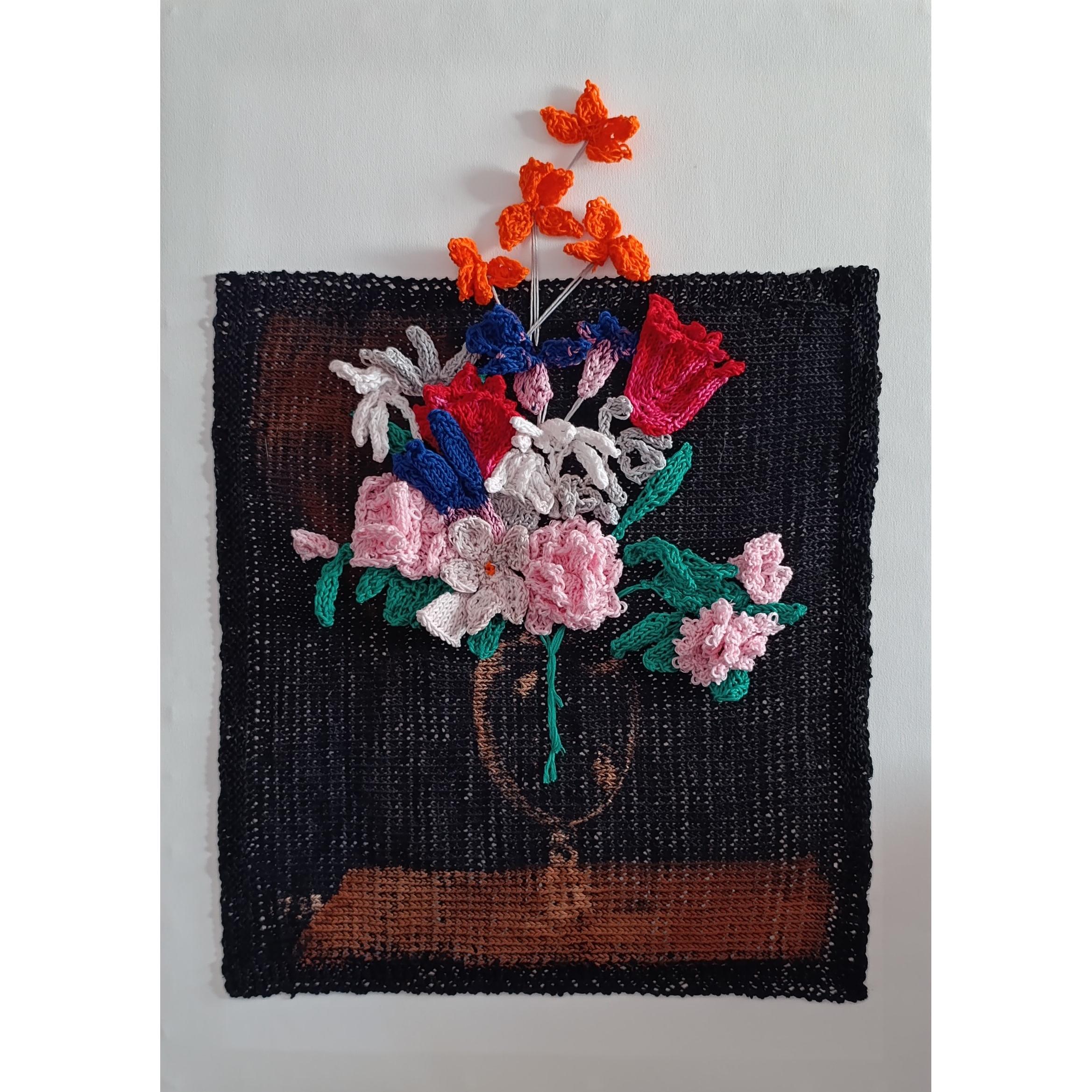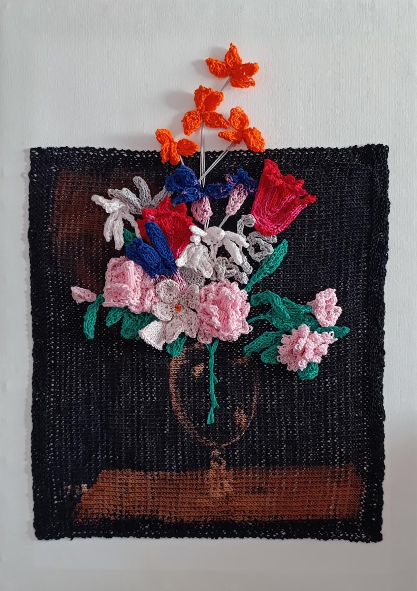 Creata per essere esposta con le opere di Sul filo dell'Arte, associazione artistica di Vedano sul Lambro, questa opera imita un dipinto floreale di Brueghel il vecchio. Il materiale è cotone, fissato in diversi modi su una tela bianca; le variazioni di intensità dei colori nei fiori sono state ottenute con pennellate di candeggina o immersioni nella stessa, così come l'effetto del piano d'appoggio, del vaso di vetro e della luce incidente su sfondo nero.